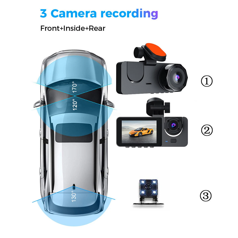 GRABACIÓN DE TRIPLE CANAL: Capture todo lo que sucede delante, dentro y detrás de su vehículo simultáneamente. Esta cobertura integral proporciona pruebas completas y tranquilidad, sin puntos ciegos durante su viaje o en caso de un incidente.