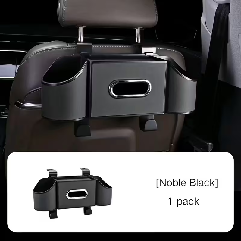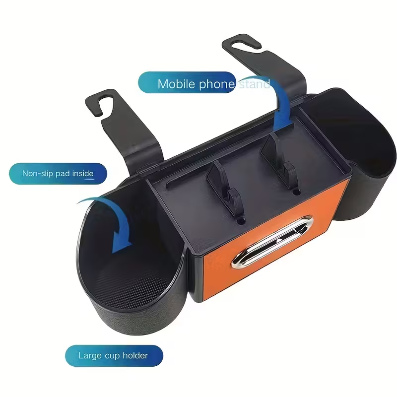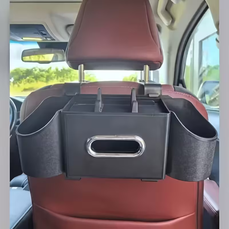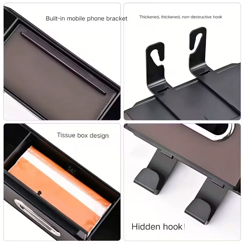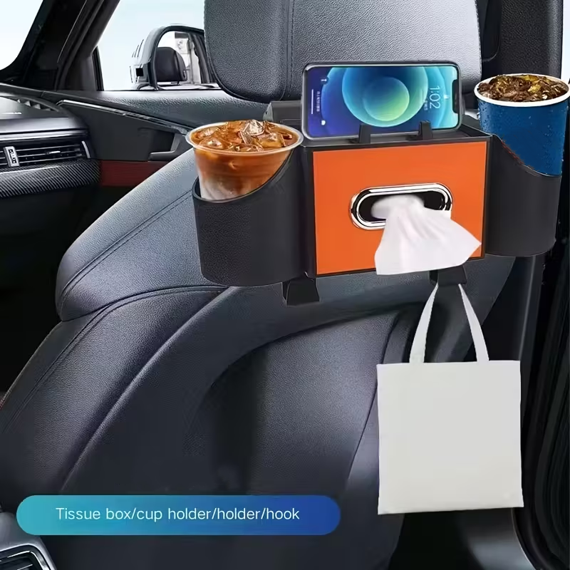 DISEÑO MULTIFUNCIONAL 4 EN 1: Mantén el interior de tu coche perfectamente organizado. Este organizador combina un dispensador de pañuelos, dos portavasos, un soporte para teléfono y ganchos para bolsas, manteniendo todos tus objetos esenciales al alcance de la mano de los pasajeros.