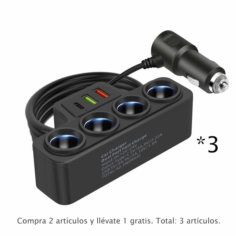 AMPLIACIÓN MASIVA: convierte una toma en cuatro tomas de 12 V/24 V y tres puertos USB, lo que le permite alimentar hasta siete dispositivos simultáneamente, eliminando las colas de carga en la carretera.