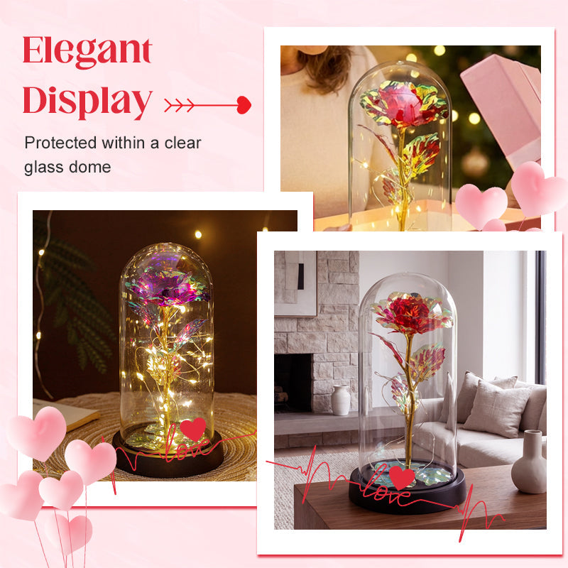 ELEGANTE CÚPULA DE CRISTAL: una cúpula de cristal transparente protege la delicada rosa del polvo y los daños, al tiempo que ofrece una hermosa vista de 360 grados, mostrando con elegancia sus intrincados detalles desde todos los ángulos posibles.