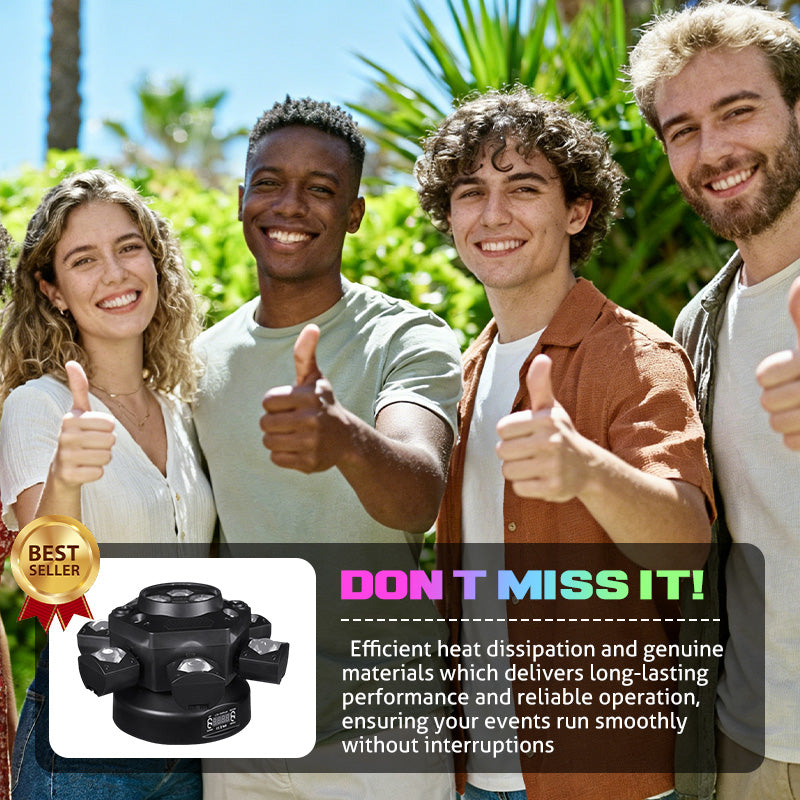 DISEÑO DINÁMICO DE SEIS BRAZOS - Cuenta con seis brazos que se mueven de forma independiente, cada uno de los cuales proyecta un potente haz de luz. Esto crea efectos impresionantes que llenan la sala y espectáculos de luces energéticos que cautivan a cualquier público, mejorando el ambiente de su evento.