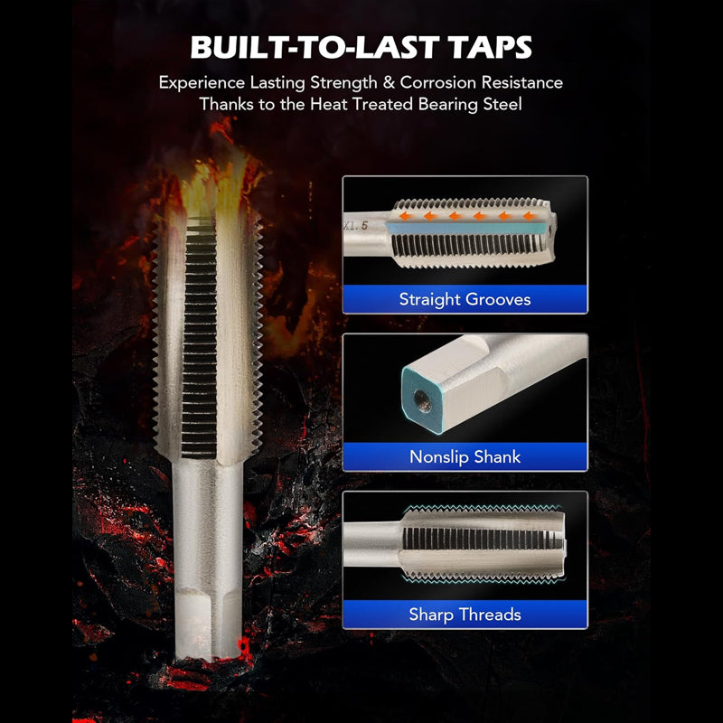 TARAUDS EN ACIER RAPIDE - Fabriqués en acier rapide HSS4241, les tarauds sont exceptionnellement durs et résistants à l'usure. Ils permettent un retaraudage propre et précis du trou de vidange, garantissant une réparation durable et fiable.