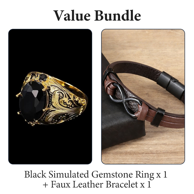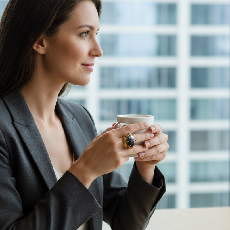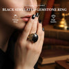 PIEDRA CENTRAL LLAMATIVA: Una gran piedra preciosa sintética negra facetada sirve como pieza central impactante. Este punto focal dominante atrae la mirada, transmitiendo confianza y gusto refinado para cualquier ocasión.